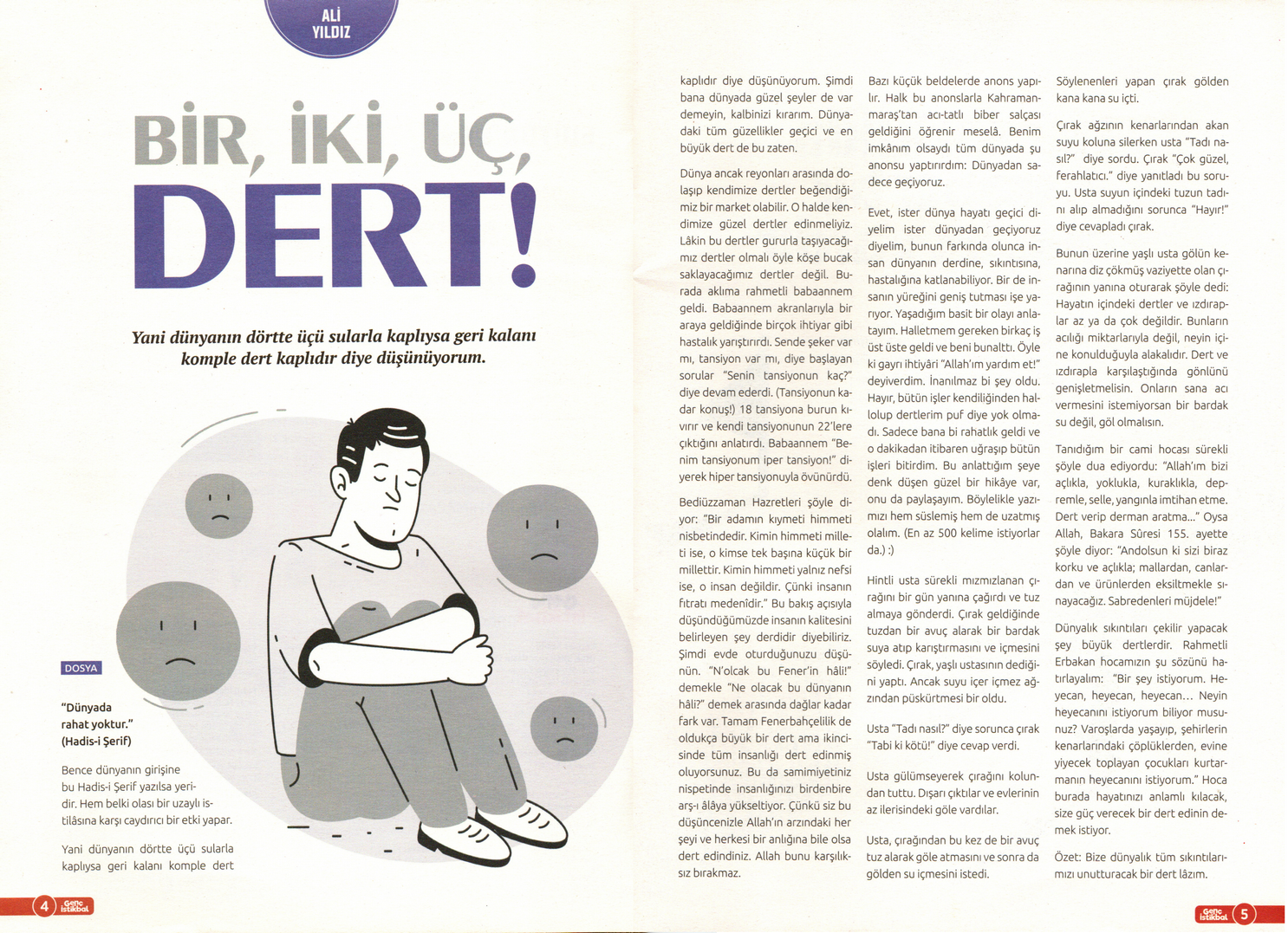 Bediüzzaman Hazretleri şöyle diyor: "Bir adamın kıymeti himmeti nisbetindedir. Kimin himmeti milleti ise, o kimse tek başına küçük bir millettir. Kimin himmeti yalnız nefsi ise o, insan değildir. Çünki insanın fıtratı medenîdir." Bu bakış açısıyla düşündüğümüzde insanın kalitesini belirleyen şey derdidir diyebiliriz. Şimdi evde oturduğunuzu düşünün. "N'olcak bu Fener'in hâli!" demekle "Ne olacak bu dünyanın hâli?" demek arasında dağlar kadar fark var. Tamam Fenerbahçelilik de oldukça büyük bir dert ama ikincisinde tüm insanlığı dert edinmiş oluyorsunuz. Bu da samimiyetiniz nispetinde insanlığınızı birdenbire arş-ı âlâya yükseltiyor. Çünkü siz bu düşüncenizle Allah'ın arzındaki her şeyi ve herkesi bir anlığına bile olsa dert edindiniz. Allah bunu karşılıksız bırakmaz.