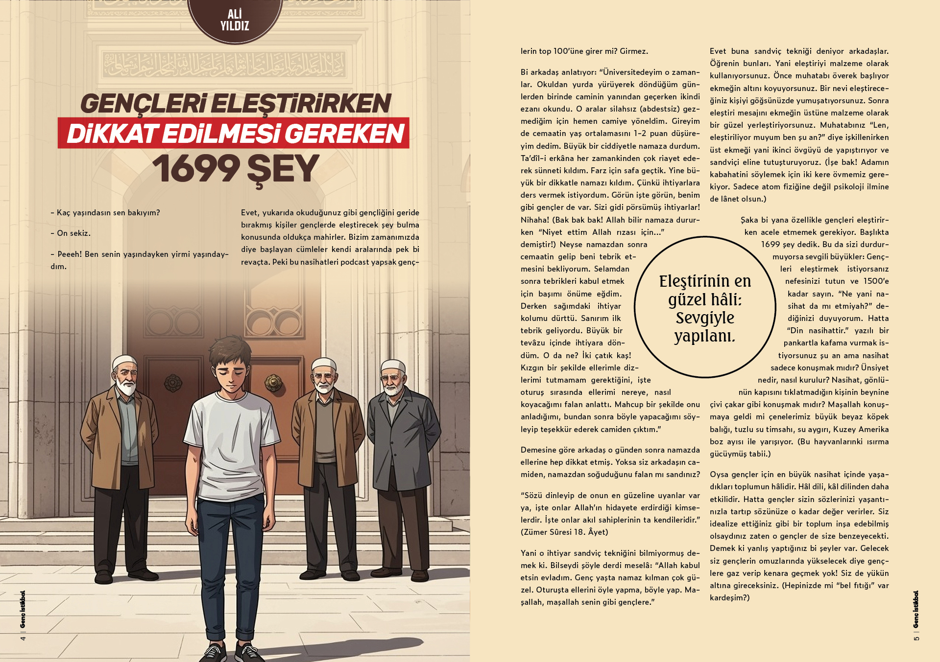 Şaka bi yana özellikle gençleri eleştirirken acele etmemek gerekiyor. Başlıkta 1699 şey dedik. Bu da sizi durdurmuyorsa sevgili büyükler: Gençleri eleştirmek istiyorsanız nefesinizi tutun ve 1500'e kadar sayın. "Ne yani nasihat da mı etmiyah?" dediğinizi duyuyorum. Hatta "Din nasihattir." yazılı bir pankartla kafama vurmak istiyorsunuz şu an ama nasihat sadece konuşmak mıdır? Ünsiyet nedir, nasıl kurulur? Nasihat, gönlünün kapısını tıklatmadığın kişinin beynine çivi çakar gibi konuşmak mıdır? Maşallah konuşmaya geldi mi çenelerimiz büyük beyaz köpek balığı, tuzlu su timsahı, su aygırı, Kuzey Amerika boz ayısı ile yarışıyor. (Bu hayvanlarınki ısırma gücüymüş tabii.)