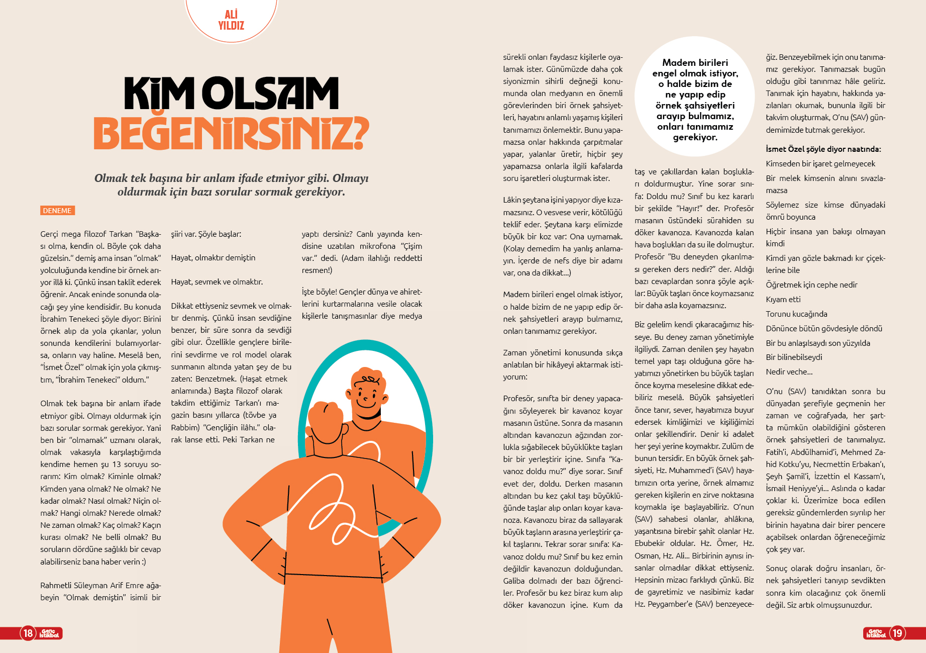 Gerçi mega filozof Tarkan "Başkası olma, kendin ol. Böyle çok daha güzelsin." demiş ama insan "olmak" yolculuğunda kendine bir örnek arıyor illâ ki. Çünkü insan taklit ederek öğrenir. Ancak eninde sonunda olacağı şey yine kendisidir. Bu konuda İbrahim Tenekeci şöyle diyor: Birini örnek alıp da yola çıkanlar, yolun sonunda kendilerini bulamıyorlarsa, onların vay haline. Meselâ ben, "İsmet Özel'' olmak için yola çıkmıştım, "İbrahim Tenekeci" oldum.
