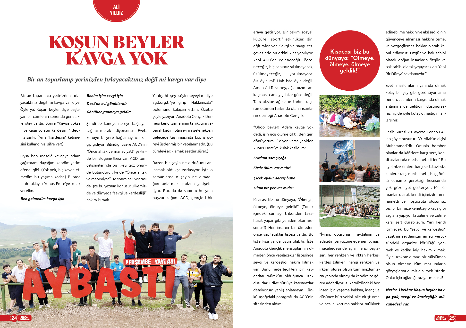 Kısacası biz bu dünyaya; "Ölmeye, ölmeye, ölmeye geldik!" (Tırnak içindeki cümleyi tribünden tezahürat yapar gibi yeniden okur musunuz?) Her insanın bir ölmeden önce yapılacaklar listesi vardır. Bu liste kısa ya da uzun olabilir. İşte Anadolu Gençlik mensuplarının ölmeden önce yapılacaklar listesinde sevgi ve kardeşliği hakim kılmak var. Bunu hedefledikleri için kavgadan mümkün olduğunca uzak dururlar. Etliye sütlüye karışmazlar demiyorum yanlış anlamayın. Çünkü aşağıdaki paragrafı da AGD'nin sitesinden aldım: