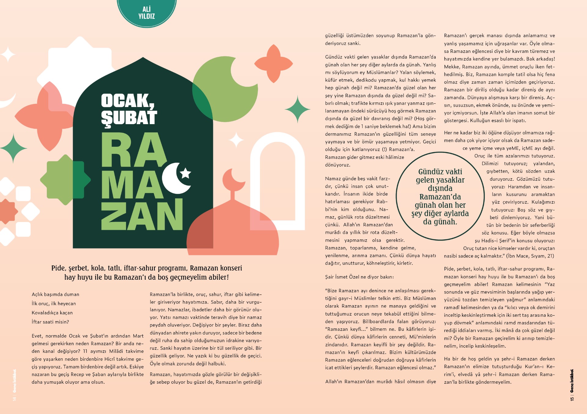 Pide, şerbet, kola, tatlı, iftar-sahur programı, Ramazan konseri hay huyu ile bu Ramazan'ı da boş geçmeyelim abiler! Ramazan kelimesinin "Yaz sonunda ve güz mevsiminin başlarında yağıp yeryüzünü tozdan temizleyen yağmur" anlamındaki ramadî kelimesinden ya da "kılıcı veya ok demirini inceltip keskinleştirmek için iki sert taş arasına koyup dövmek" anlamındaki ramd masdarından türediği iddiaları varmış. İki mânâ da çok güzel değil mi? Öyle bir Ramazan geçirelim ki arınıp temizlenelim, incelip keskinleşelim.