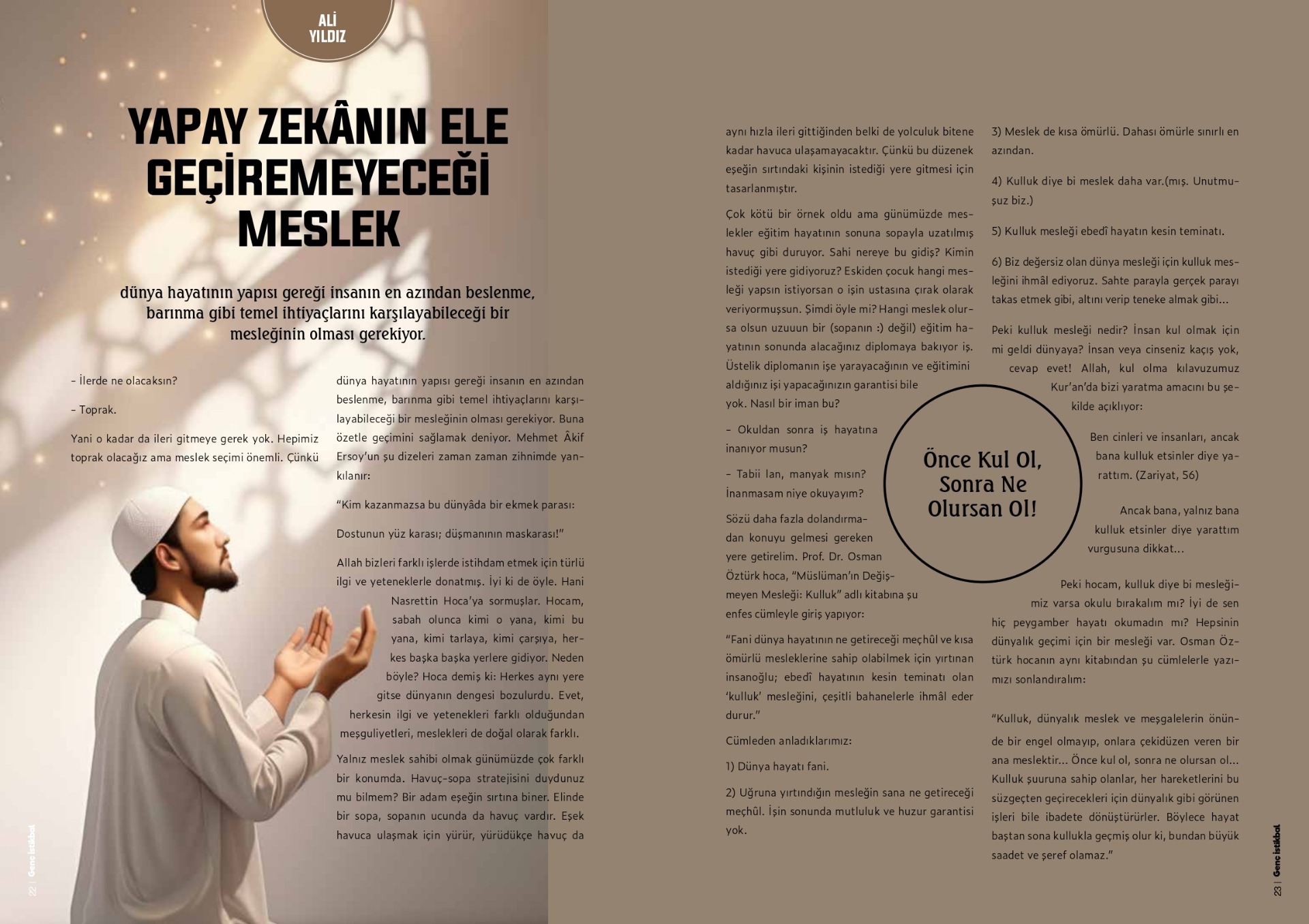 Yani o kadar da ileri gitmeye gerek yok. Hepimiz toprak olacağız ama meslek seçimi önemli. Çünkü dünya hayatının yapısı gereği insanın en azından beslenme, barınma gibi temel ihtiyaçlarını karşılayabileceği bir mesleğinin olması gerekiyor. Buna özetle geçimini sağlamak deniyor. Mehmet Âkif Ersoy'un şu dizeleri zaman zaman zihnimde yankılanır: